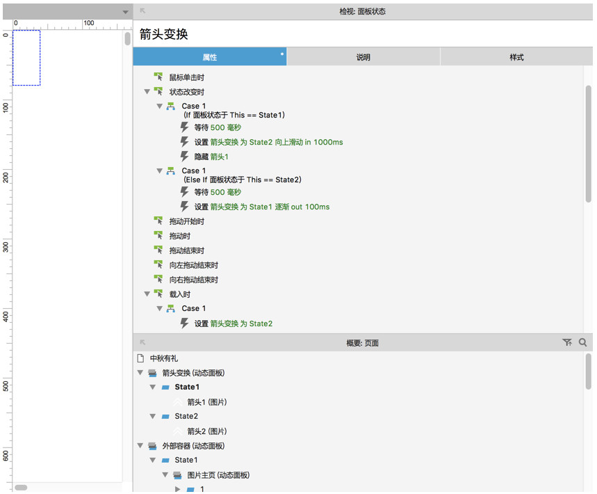 可以看出來,將之前的一個靜態(tài)圖標,改成了一個動態(tài)面板(箭頭變換),里面添加了兩種狀態(tài),State1里的箭頭位于動態(tài)面板靠下的位置,State2里的箭頭位于動態(tài)面板靠上的位置,并添加了兩個事件: