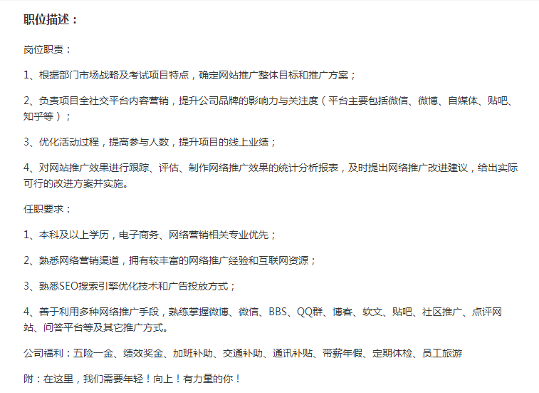 選擇“新媒體運(yùn)營”這個(gè)職位我們來看看這個(gè)職位的介紹和要求: