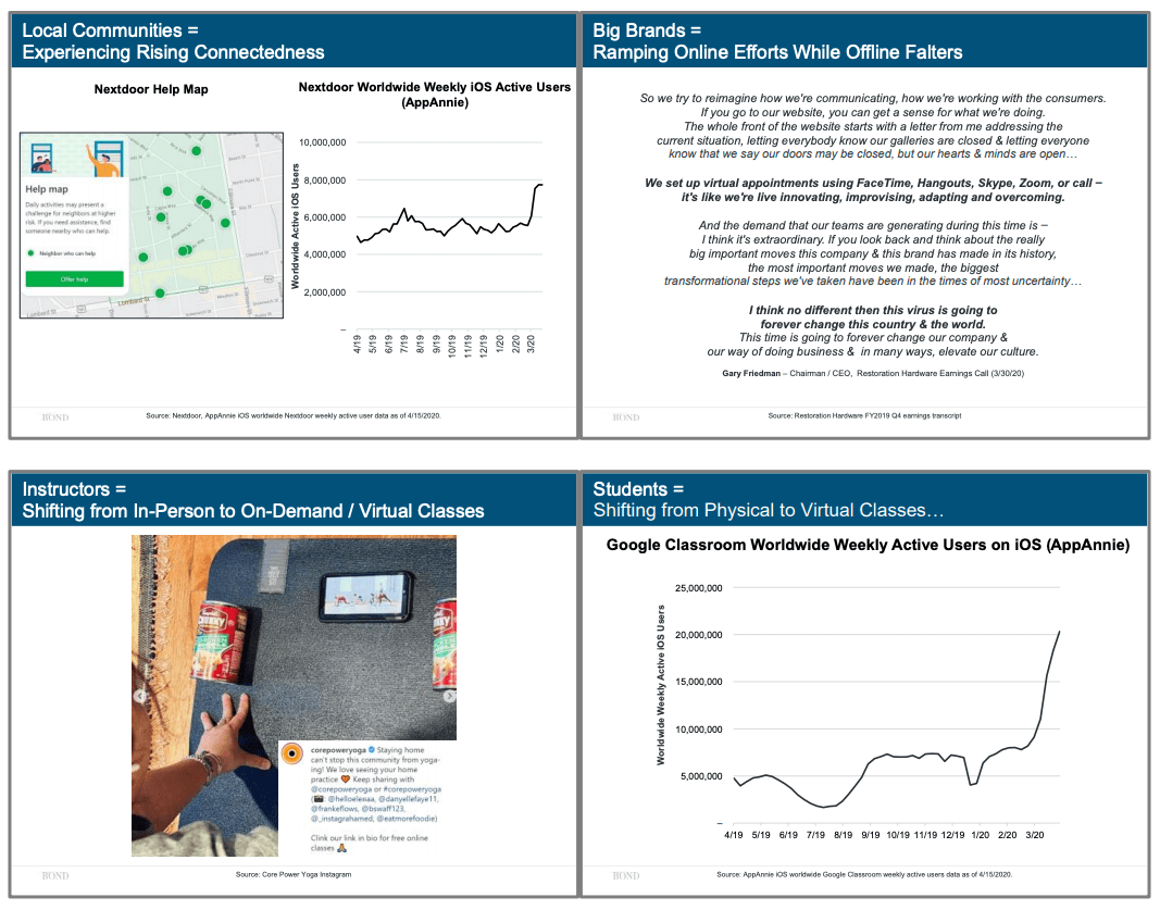 2020年4月17日,硅谷最著名市場研究機(jī)構(gòu)和風(fēng)投公司之一 Bond Capital, 發(fā)布了最新一期的《互聯(lián)網(wǎng)趨勢報(bào)告》。 完整版下載請見最底部