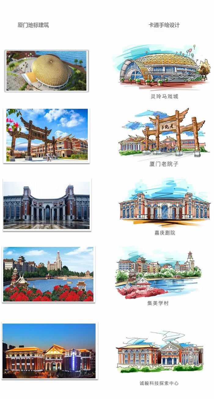 我們根據(jù)廈門(mén)的地標(biāo)照片,采用速寫(xiě)風(fēng)格來(lái)為每個(gè)地標(biāo)繪制二次元插畫(huà)線(xiàn)稿,并上色