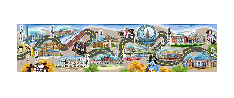 因?yàn)榭紤]到廈門(mén)集美區(qū)是一個(gè)人文氣息濃厚的地方,又要突然二次元?jiǎng)勇鸟R拉松主題,并且需要畫(huà)出的11地標(biāo)中國(guó)古風(fēng)建筑比較多